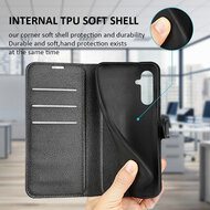 Bescherm je Samsung Galaxy A54 in stijl met de Mobydefend Wallet Bookcase. Dit hoesje is gemaakt van hoogwaardig kunstleer aan de buitenkant en een stevige houder van flexibel kunststof aan de binnenkant, waarin je de telefoon eenvoudig vastklikt. Deze combinatie van kwalitatieve materialen garandeert uitstekende bescherming voor je toestel.