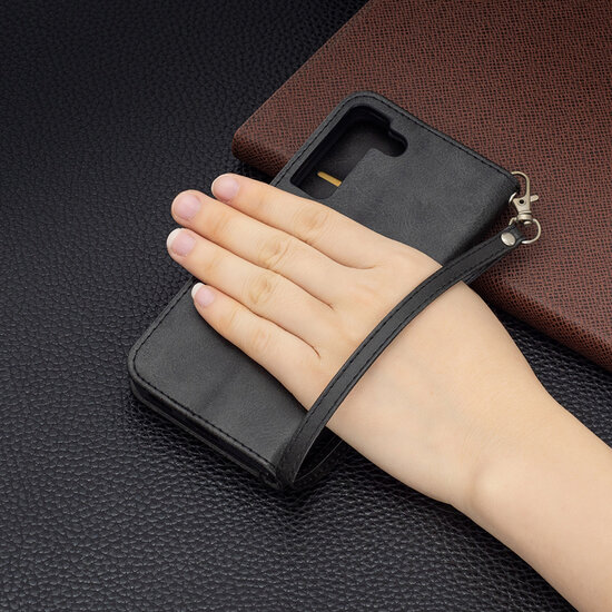 Bescherm je Samsung Galaxy S22 in stijl met de MobyDefend Wallet Book Case Met Koord. Dit hoesje is vervaardigd van hoogwaardig kunstleer aan de buitenkant en heeft een stevige houder van flexibel kunststof aan de binnenkant, waarin je je telefoon eenvoudig vastklikt. Deze combinatie van hoogwaardige materialen biedt uitstekende bescherming voor je toestel.