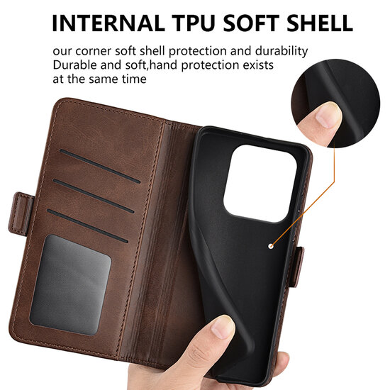 MobyDefend Luxe Wallet Book Case. Dit hoesje is gemaakt van topkwaliteit kunstleer aan de buitenkant en een stevige houder van flexibel kunststof aan de binnenkant, waarin je de telefoon eenvoudig vastklikt. Deze combinatie van materialen garandeert niet alleen een uitstekende bescherming voor je toestel en een stijlvolle look, maar verzekert ook een duurzaam hoesje dat lang meegaat.