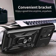 Handige functies: Dit hoesje beschikt over een uitklapbare ring die 360 graden draaibaar is, waardoor je je telefoon zowel horizontaal als verticaal kunt neerzetten. Dit biedt extra gebruiksgemak bij het kijken van video's of tijdens videogesprekken. Bovendien kan de draaibare ring ook gebruikt worden om je telefoon stevig vast te houden wat extra grip en veiligheid biedt tijdens het gebruik.